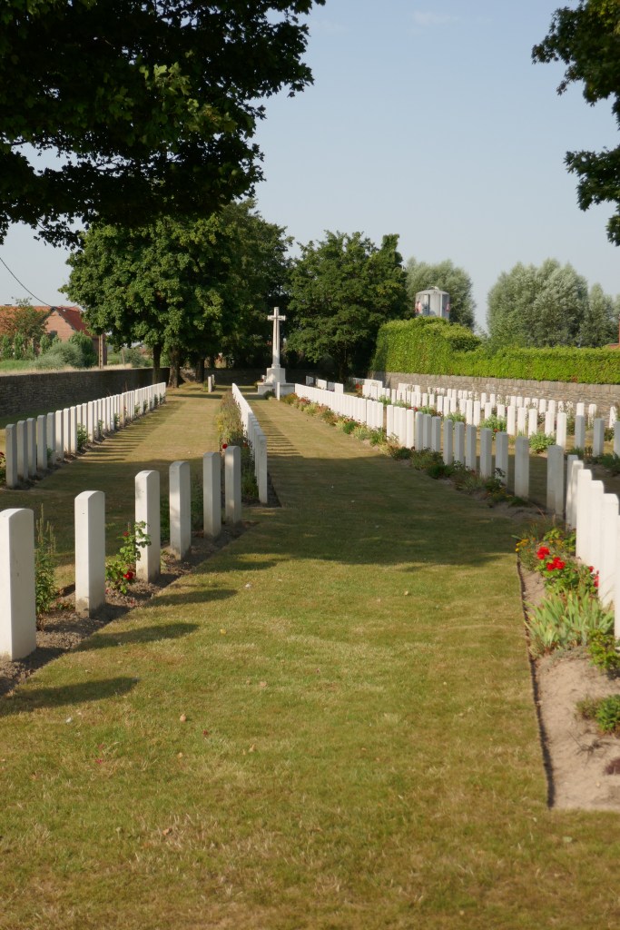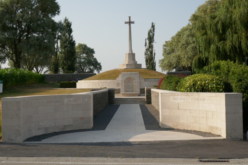 First major stop was at Messen ( Messines) where there is a memorial to the 827 NZ soldiers whose bodies were never found after that battle in 1917. Next stop was more personal, in the nearby village of Ploegsteert, at the comparatively small London Rifle Brigade cemetery, where Great Uncle Alexander Campbell is buried.