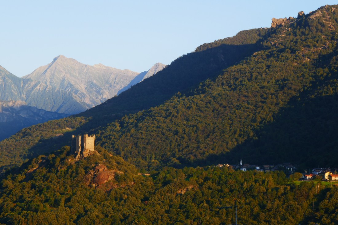 The Aosta valley is a very beautiful walk, even if the path signs seem to conspire against you by endlessly indicating “Chatillon 1hr,40m”. The valley becomes very narrow, guarded by sundry castles on both sides of the river, and the path needs to climb up, over and around rock outcrops and sometimes deep river gorges. The mountains on the far side of the valley look harmless until you see an information display that lists the peaks at over 3,000m.