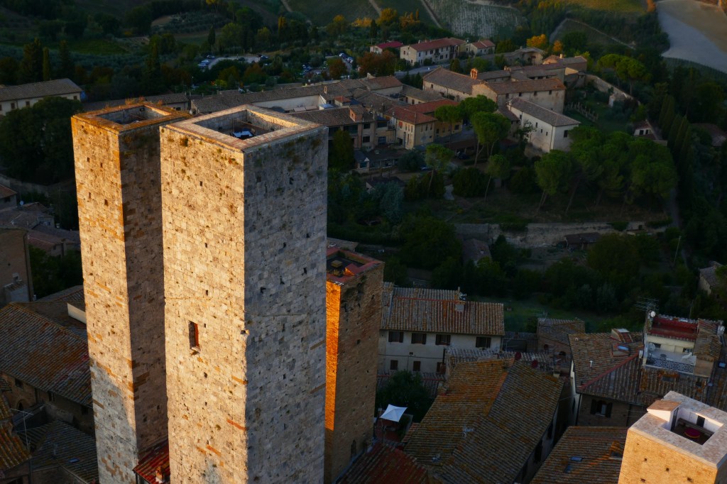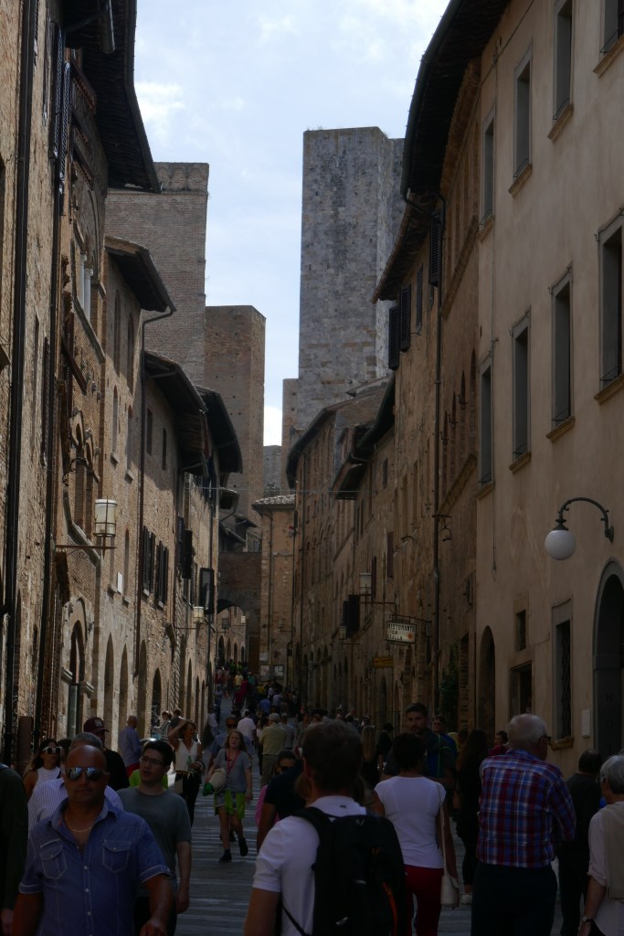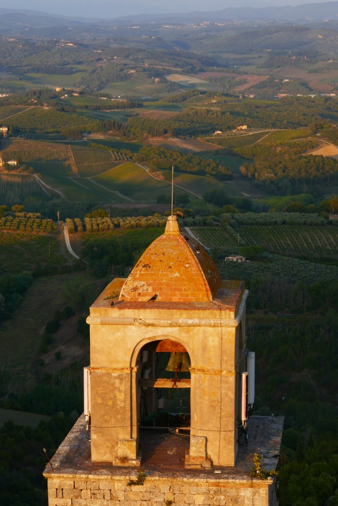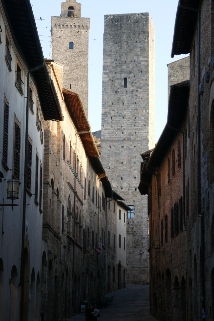 We arrived in San Gimignano in time to check into the Ostello run by the Monastery of San Girolamo, which meant we could explore the town without needing to lug around our backpacks. This was just as well, as there are so many tourists in SG that wearing a backpack would really restrict your movements. We found a restaurant in a back laneway for a really good pizza, took in a free concert by the Meibion Talgarth Mens Choir from Wales held in the Church of Saint Augustine, then retired to our digs for a snooze and to wait until the day trippers had left. In the evening we did the token tourist thing by going up the tallest of the 13 towers in the town, the Torre Grosse. At one point in the middle ages there were 72 such towers, built by the nobles as a kind of one-upmanship. When the black death hit the city, the trade routes by-passed it, which in a way helped preserve the city as a kind of time capsule.