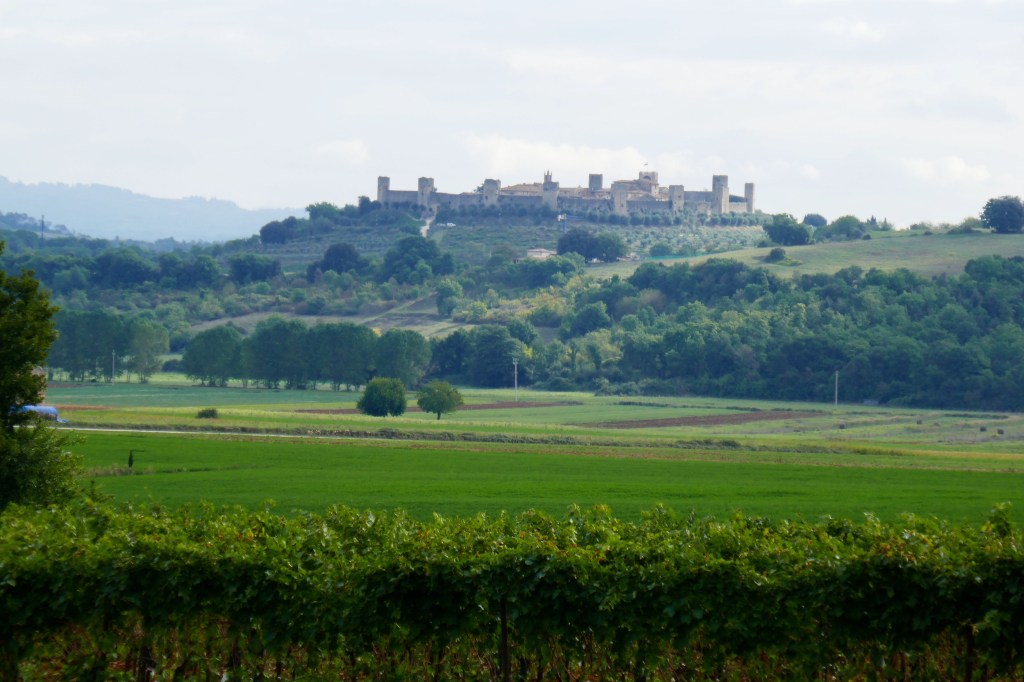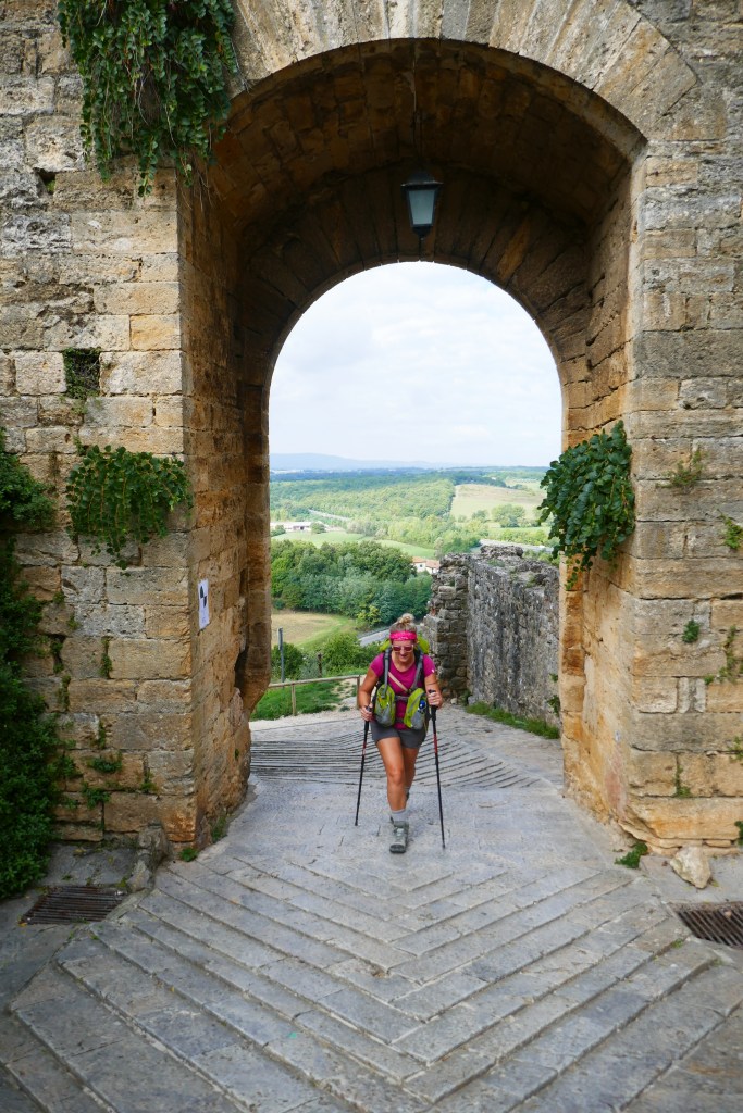 It was another grand day for sauntering through the Tuscan landscape as it was more or less Goldilocks weather – not too hot, not too cold. Despite it being another relatively short day, we found a way to take a short cut along the road towards the end of the leg, which preserved a token amount of energy for the steep approach to the town of Monteriggioni. Actually fortress would be a better word, as it is one road and a couple of alleys wide, and not much longer, and is still surrounded by its medieval walls and towers. It was a stronghold in the frontline in the wars between Siena and Florence and gave protection to the trade and pilgrimage routes, such as the via francigena.