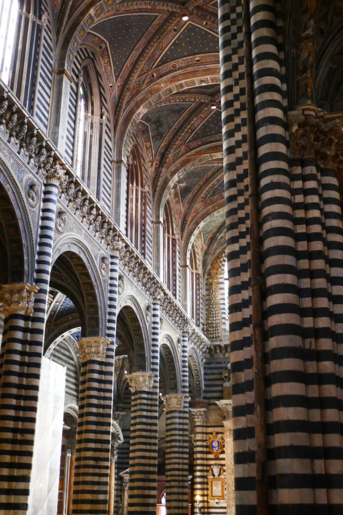 We did find a way to out manoeuvre the crowds: we headed to the Cathedral where guided tours are not permitted, and being mid afternoon, most of those having it at the top of h5he visit lists had already checked it off. And it is a stunning building, both inside and out. Many churches are worth a quick glance or longer to study the art. The Siena Cathedral has the art, design, structure and magnificent marble mosaic floors, and the Piccolomini Library has stunning frescoes and some wonderful old books on display.