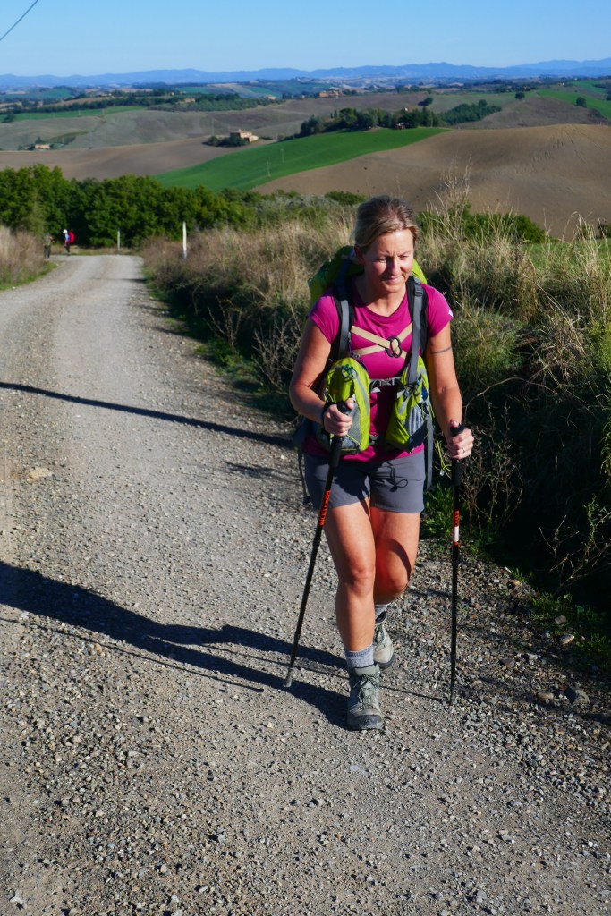 After a typical Italian breakfast in Buonconvento (cappuccino and a sweet pastry), we had a glorious day of hiking in sunny but cool weather, up hill and down dale, with distant views not only of numerous villas, hilltop villages, but even as far back as Siena. Today was Susan’s last day as my sauntering companion, as tomorrow she heads back to Siena to meet Jack, and they will do a little tiki tour before meeting me at the VF finish line in Rome in 10 days/220km (technically the end of the VF is in the Vatican, which is a sovereign state).
