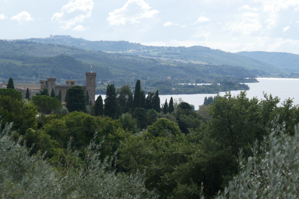 Most towns surrounding the lake are in the hills where they presumably get some cooling breezes. The path meandered around these hills through farms and forests with tantalizing glimpses of the lake, until arriving in Bolsena, the newer part of town which is lakefront, and the inevitable castle and old town above the lake. If the old town still had a wall, it would be a tourist hot spot. As it was, it was almost devoid of tourists.