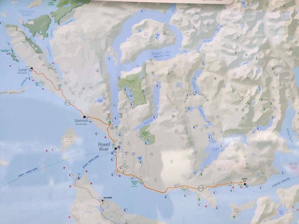 An almost relaxing overnight stop at our humble abode in Gibsons – a chance to repack and consider the items we don’t have. All of which we resolved in Sechelt: a shout out to Time Out Source for Sports, who had all the great outdoors things that the giant stores in Vancouver no longer have, such as bear spray, hiking food for the back country etc.