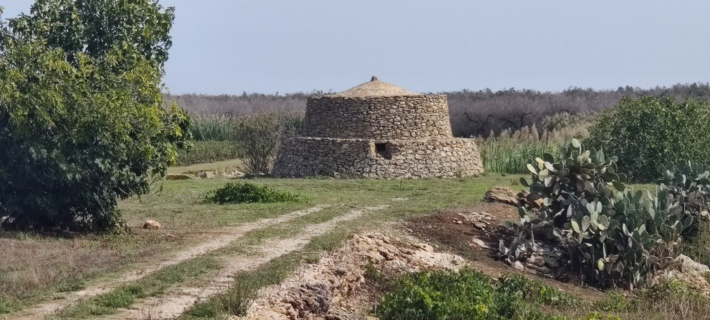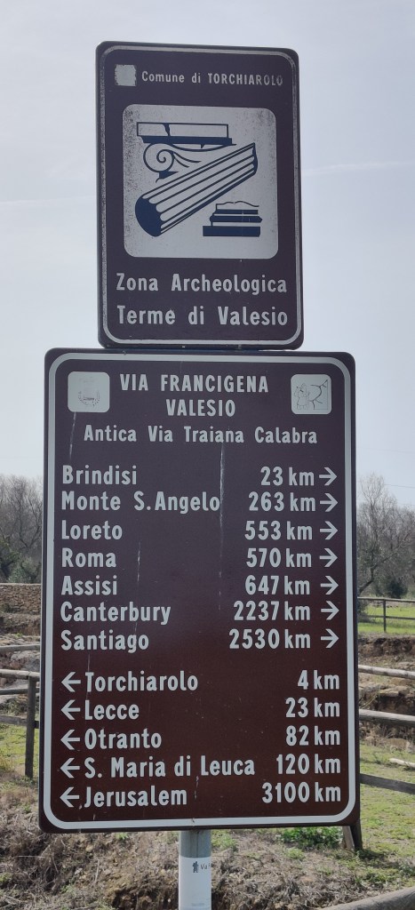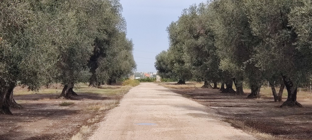 The official route today was well sign-posted, the best since we left Lazio province on day 9. It was narrow, paved back roads closer to Brindisi, but then they became gravel as we got beyond the range of the weekend hunter-gatherers. One pleasant section in a valley amongst the vineyards would have been a nightmare if the sun hadn’t had thirty minutes to dry off the rain shower. I celebrated the lack of mud by doing some pre-production quality control of the wine. I did, however, miss my Camino buddy, Sam, who is hoping a couple of extra rest days will allow him to recover sufficiently to tackle the final stretch into Santa Maria di Leuca. He and Susan are taking the train to Lecce tomorrow, leaving me to suffer two consecutive days of cafe-less walking.