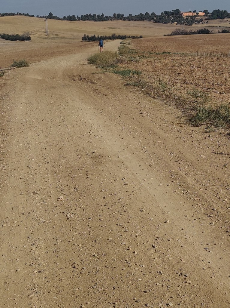 Today’s stage was the best yet – awesome scenery, good route, and not too hot. There was an early morning shower pre-departure which made the first couple of hours feel like being on a treadmill in a steam room, but after that it was just normal Spanish heat. Leaving Utrera it felt like being back in Italy, with narrow country lanes, olive groves, houses with big dogs, and lots of roadside garbage. Eventually we hit the countryside and we’re in open spaces. The route was almost a straight line between the towns as it followed the former path of the Roman via Serrana.