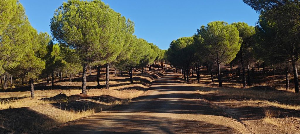 Walking in the dark wasn’t a problem as the first 16 km were on a reasonably quiet road, but leaving town before any of the cafes opened really cranked up the penance value of today’s stage. After 3 hours of road walking, the route went through more dehesa, mostly cork trees and pines, until a short but brutally steep ascent to the Cerro del Calvario, which gave a magnificent view over the entire Finca de Berrocal estate that we’d just walked through.