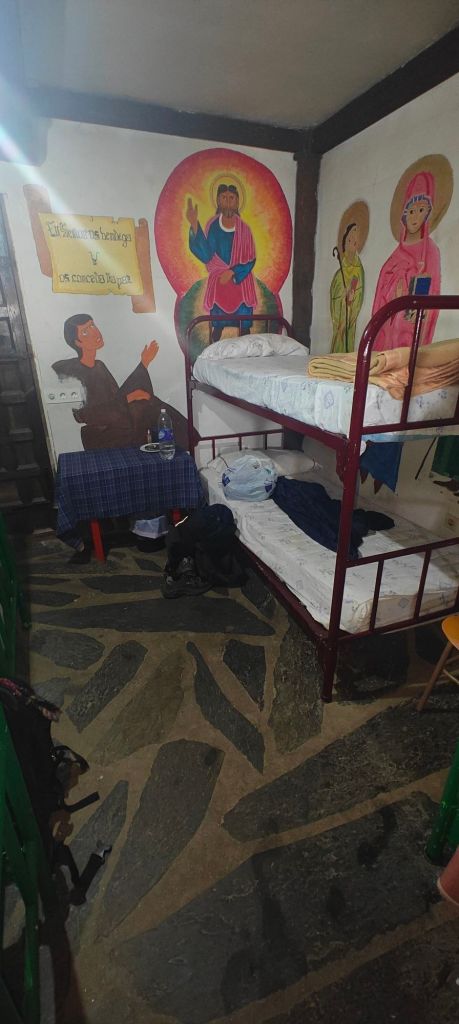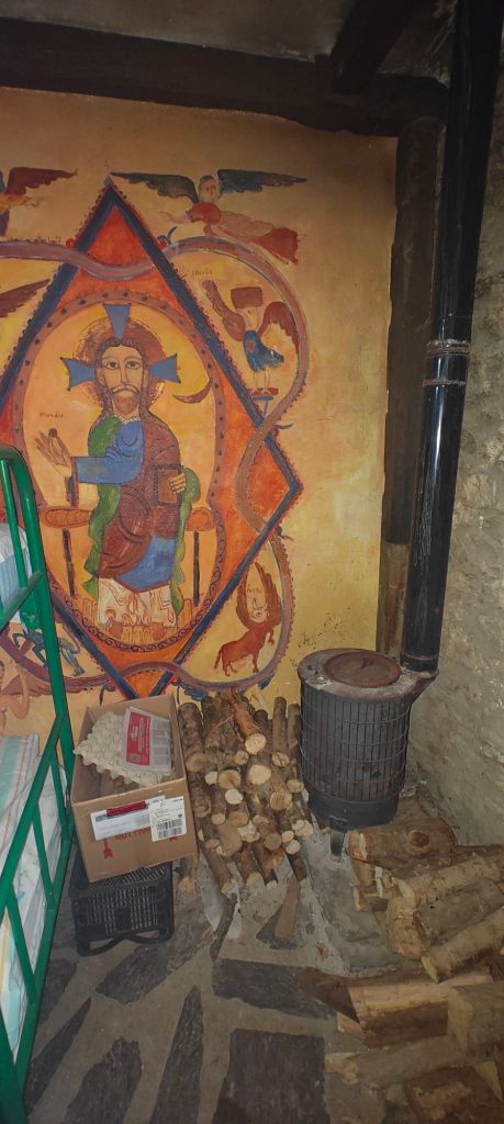 Tonight’s albergue is of unknown age, and our dorm room has stone walls 3 feet thick, one window about 1 foot by one foot, stone floors, and a wood stove ensuring that every item we possess smells of wood smoke. And just to remind us that the albergue is run by the parish, the internal wall and part of the ceiling are lavishly decorated. But with only a single light bulb, details are hard to distinguish!
