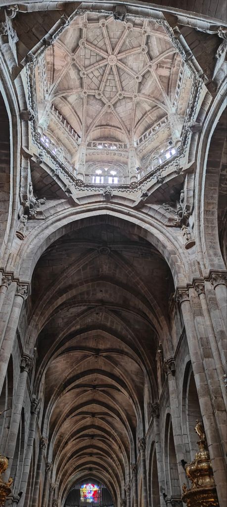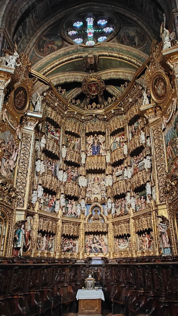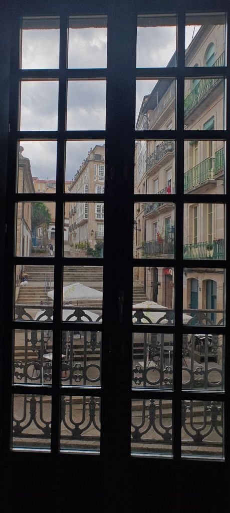 Ourense has been around since well before the Romans showed up. It has a strategic location on the river Minho, which for much of its length forms the border between Spain and Portugal – which we crossed by motorized dinghy in the fog when we walked the Camino Portuguese. It also has natural thermal pools, but I wasn’t sure if they’d appreciate me showing up in my now battered Lulu running shorts. The old town is quite compact, with the highlight being its Cathedral, built from the 11th C onwards, and if one melted down all the gold leaf the church in Rome wouldn’t be destitute any more!