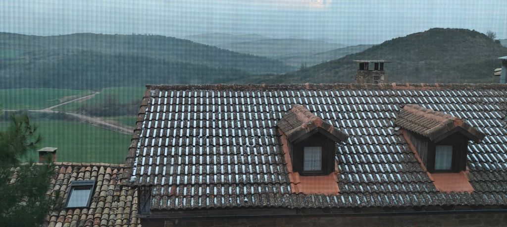As the albergue’s first visitor for the season I tried not to be rude. Breakfast was a long drawn out affair, and I was keen to get started. The albergue is a restored school building, built from stone without any heating. It’s probably pleasantly cool in the summer. I was glad to have packed the full wool long john set and the artic grade sleeping bag, despite the extra weight! Snow and wind chill was not featured in the tourist brochure. However, once I got started it wasn’t too bad except for the first 10 minutes. After that I was around the corner of the hillside and in the scrubby forest, and therefore sheltered from the wind. But not the snow, although very little was settling. Later on the sun did its best to come out, so it was odd to enjoy the sun’s warmth while it was continuing to snow.