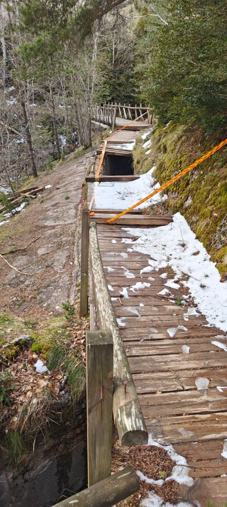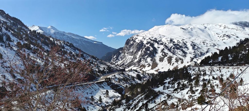 Right near the top the trail became obscured by the snow, so I walked up the road for the last 2 km. Traffic was almost non- existent as all the vehicles are destined for the ski area. Somport pass, at 1640m, was a bit breezy and as both cafes were closed, there was no reason to linger. On the French side I couldn’t even see the trail, so I headed down on the road. Just down the road ( but definitely not down the trail) there was a very new Pyrenees National Park facility, complete with cafe. Yay. Cafe au lait and choclatine (as Spanish Napolitanas or Parisian pain au Chocolat are known – according to the nice lady serving!)
