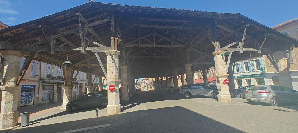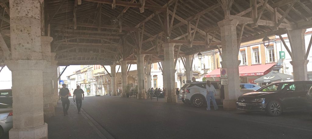 The day’s other memorable moment was the result of a detour off the marked path. I ventured into the town of Gimont to provision for lunch+dinner+breakfast and found a very old covered market in the town square. Today it’s given over to a couple of restaurants and the inevitable car parking, but I’ve never seen anything like it before. It didn’t really lend itself to a photo, but you’ll get the gist from this snaps: