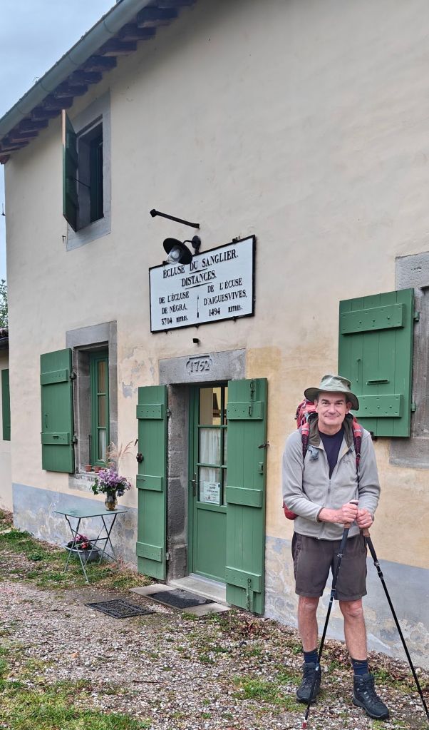 The morning walk was another 20 km of canal. It made for fast walking, and the engineering and surveying marvel it represents are incredible, but after 45 km and 9 hours of walking I was done marvelling! The path departed from the canal at Naurouze, which is the point where the canal either flows east or west. Part of the design challenge for the canal was finding a water source to feed the flow at this mid point, so for the next couple of days the path follows the feeder channel which winds its way from the lakes in the hills to provide the water to make it all work.