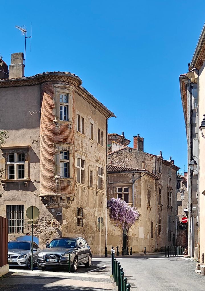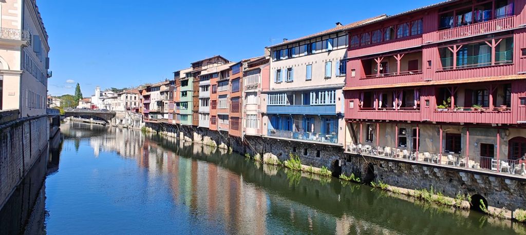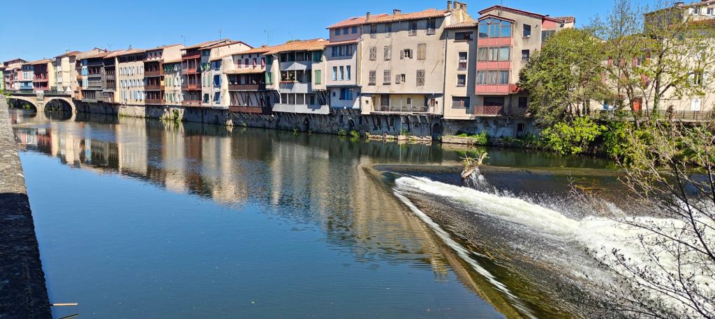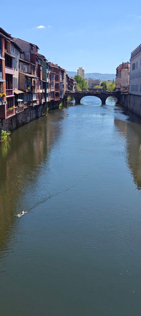 The countryside was unremarkable, but Castres is a very pretty town. It’s not that big – about 42,000 inhabitants, but despite its size it is home to one of French Rugby’s Top 14 teams (who have at least one Canadian and one former All Black on their roster). For the first time since arriving in France, I was in time to partake of the lunchtime ‘menu du jour’, and there were a couple of likely looking restaurants near tonight’s gîte. However I decided to head to the gîte to drop off my backpack, and Madeleine, who runs it was home, and within 5 minutes I had a cold beer and she was reheating leftover shepherd’s pie for my lunch. With wine, cheese, coffee and home baking!