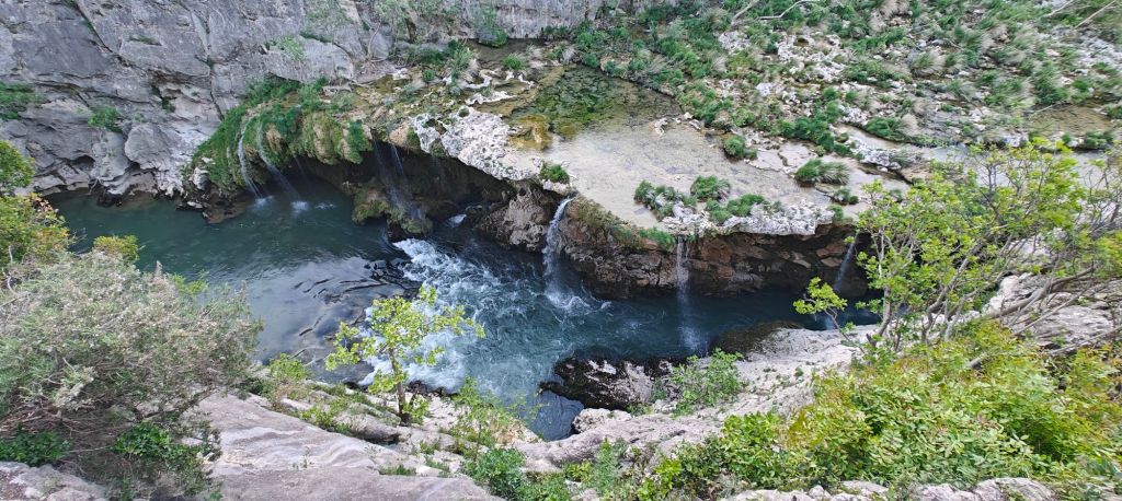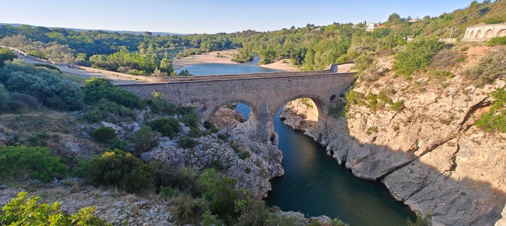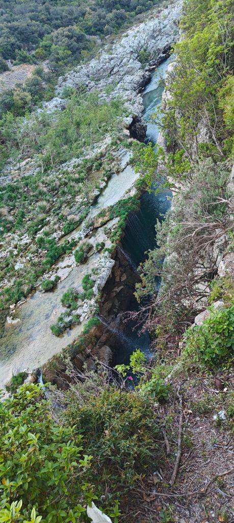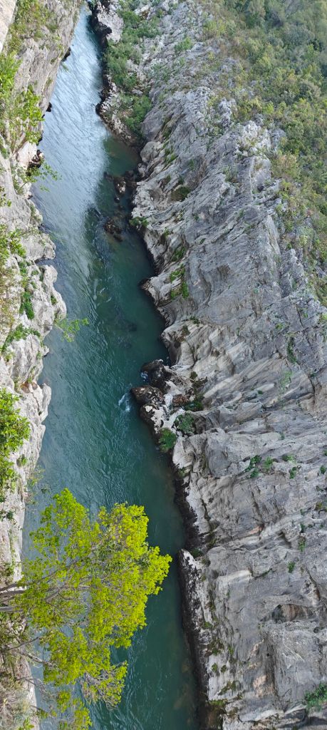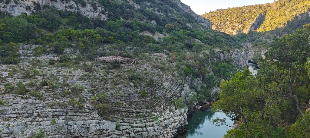 The initial “path” this morning was the edge of the road. The Herault gorge is one of France’s more famous geographic features, but by driving the road up the canyon you can’t actually see it, and there are no pull outs – at least not in the section from St Guilhem to the exit. Walking along the edge of the road you can peer over the concrete safety barrier into the abyss!