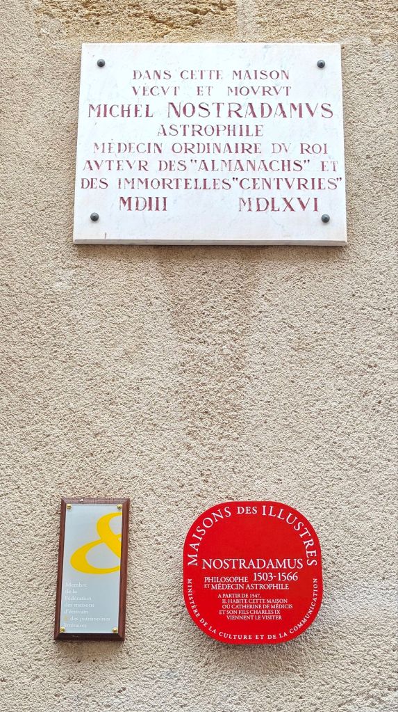 One of the two surviving city gates The 17th C town hall The clock tower from the other side, including moon phases. What the opposite face shows is beyond my knowledge base!Plaques on the Nostradamus house, which as you can probably predict, is now a museum.